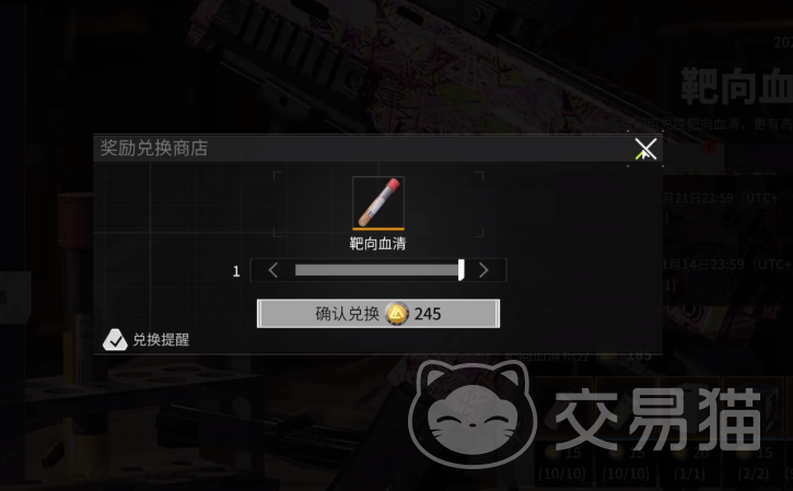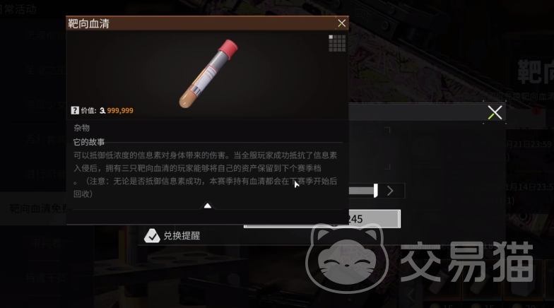 如果想保留物品的话,玩家就需要在游戏里收集靶向血清,而且必须收集够三个才可以,这样玩家就可以把游戏里所有的装备都能保留下来,可以通过在游戏里参与任务获取免费的靶向血清,也可以选择在游戏里使用游戏币兑换,245个游戏币可以兑换一个血清,这样玩家集齐三个之后,游戏里的皮肤装备都能得到保留,在上线之后,玩家就可以利用这些别人都没有的道具快速称霸整个游戏。
