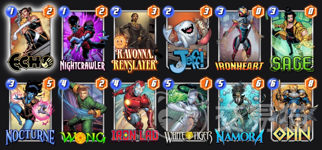这套牌组的玩法是不断利用揭示效果提升主战区的能力,纳摩拉的揭示效果是当其他区域只有一张卡牌的时候,自己的战斗力增加5点,达到11点,奥丁的效果是直接触发所在区域卡牌的揭示效果,白虎则是会向另一个战区放置一张战斗力为8的灵虎,这样就能完美触发纳摩拉的揭示,同时王会让所在区域的揭示卡牌触发两次揭示效果,这样纳摩拉就会拥有16点战力,对战场局势有着很强的主导作用。
