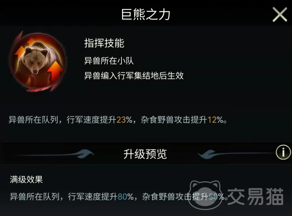 最后一个狂暴撕咬,在攻击距离和选择数量方面与怒击重爪相同,但需要一回合准备时间有百分之六十几率造成伤害。接下来还有一些对小队成员进行加成的技能,例如高级防御和高级攻击以及巨熊之力等。巨熊之力是自身专属,能够提高所在队列行军速度和杂食野兽攻击力。