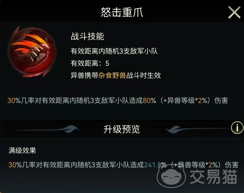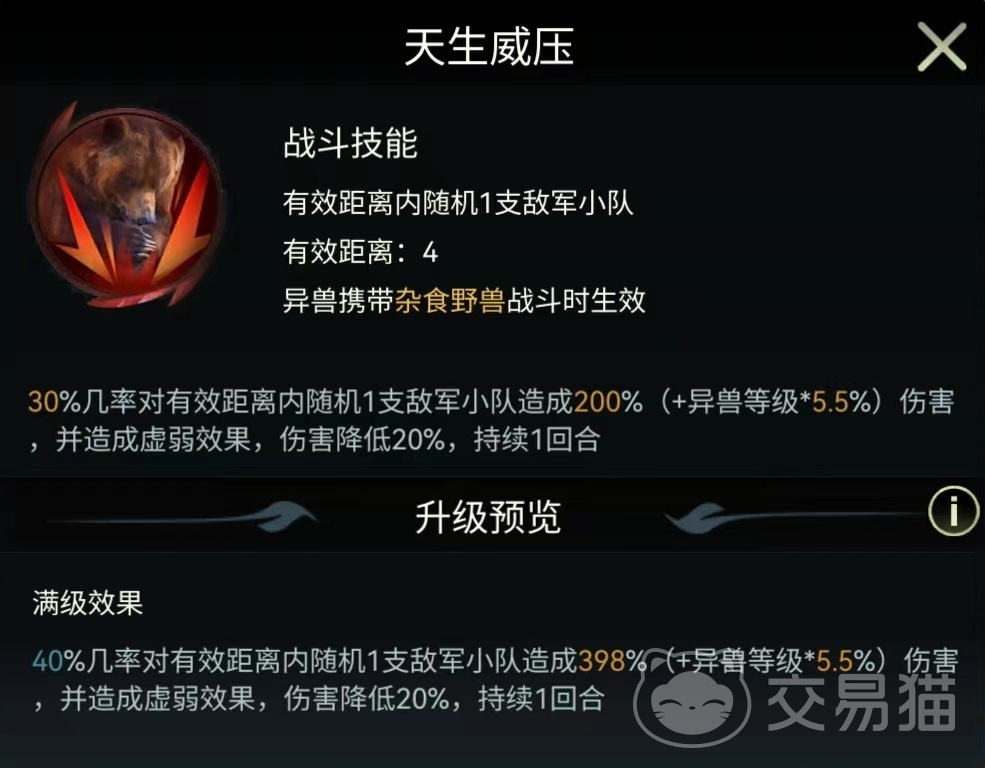 天生威压,该技能有四格有效攻击距离,需要携带杂食野兽战斗才能生效。在达到满级时有40%几率,在攻击范围之内随机选择一支敌军小队,造成高额伤害并附带虚弱效果。对方被虚弱影响后,在接下来一回合内伤害降低20%。该技能可以有效克制那些依靠输出的对方小队,进行很好的限制。第2个怒击重爪,该技能有效距离为5格,会有30%几率选择三支敌军小队造成伤害,虽然伤害单体数量上不如天生威压,但胜在输出目标多,可以快速压下对方的血线。