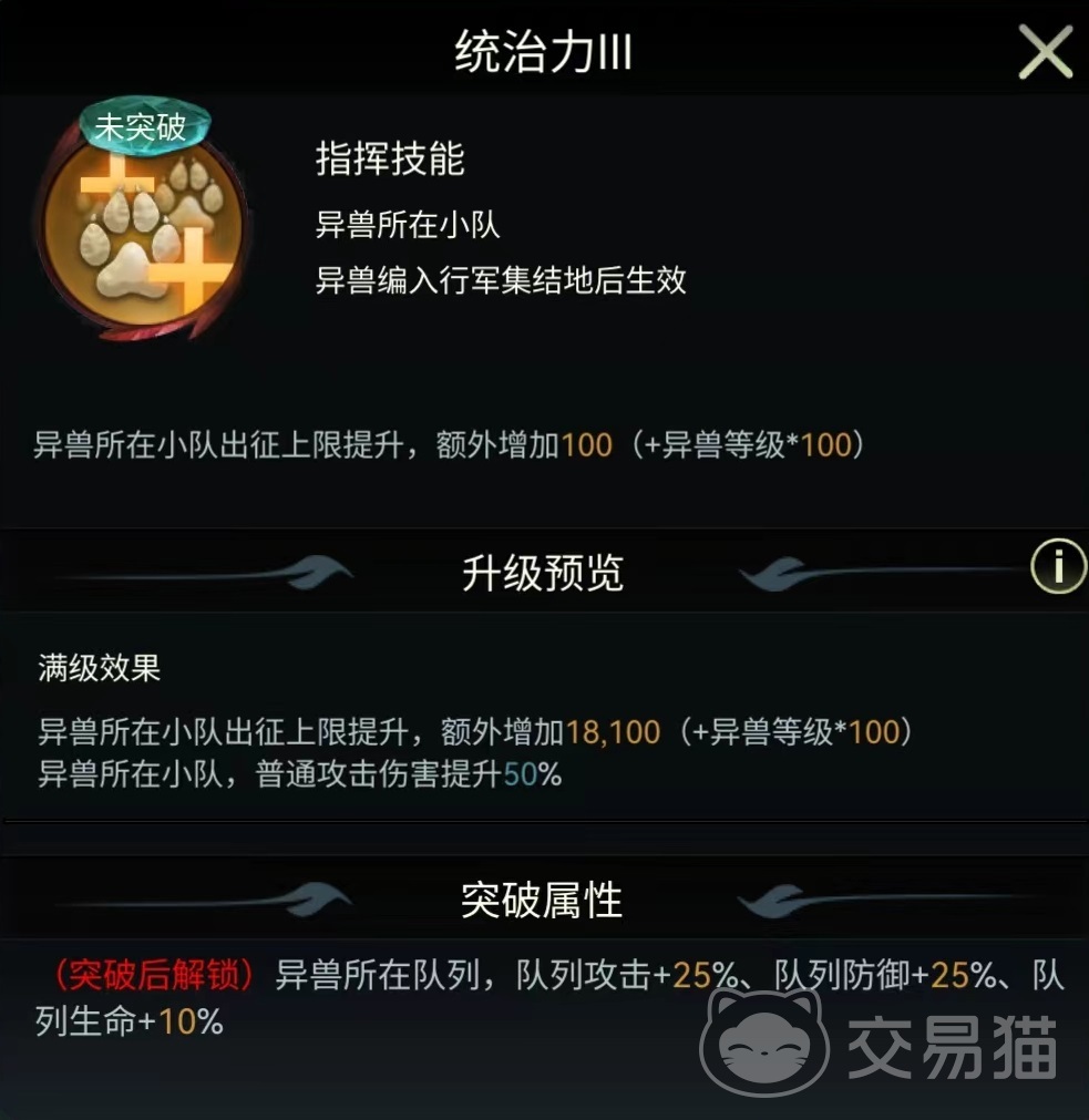 花豹虽然是战斗宠物,但它属于通用类型。意味着这样的异兽可以适应各种场合,无论率领杂食、肉食还是食草,都能发挥出技能的所有效果,这在搭配中是很有优势的。先来看一下自身统治力技能,因为属于通用类型,所以小队成员都可以享受到队列攻击增加,队列防御增加和生命值增加等优势。