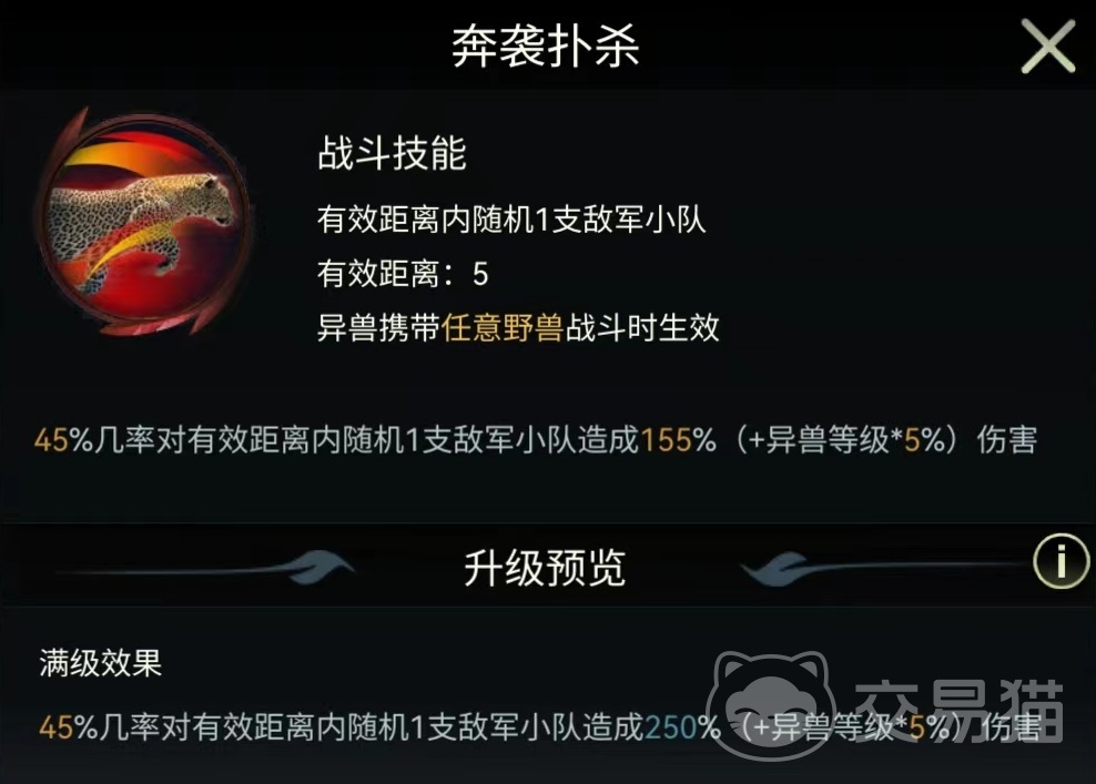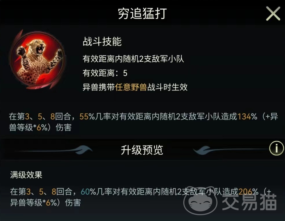 除此之外,还具有高级防御和高级攻击这两个通用类型加成技能,使得所在小队攻击和防御都能增加55%,这样的加成数值比其他的专用异兽要低一些,但容易搭配。还有一个技能冷血猎手,所有异兽都能生效,增加50%攻击。自身还有三个直接伤害类型的技能,第1个奔袭扑杀,5格有效距离,携带任意野兽战斗都能生效,有百分之四十五几率对随机一个敌方小队造成伤害。