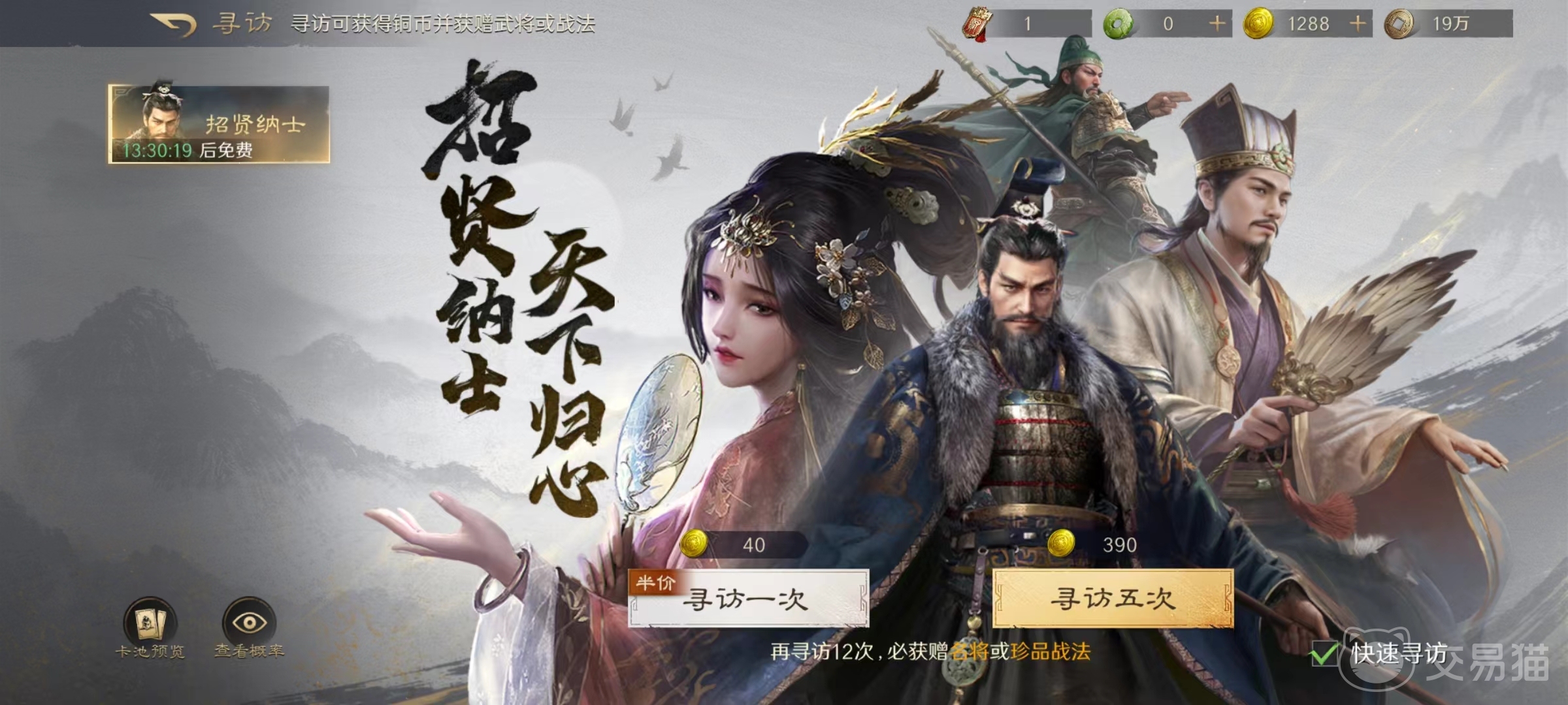 这就需要大家获得更多战法才能够进行进阶,战法获取和武将获取都属于抽取的类型,在卡池中进行寻访,可以获得铜币并赠送武将或战法,在几率方面完全随机出现。正是因为存在几率,所以大家不一定能获取自己所需要的类型,还有一些运气的成分。在其中,所以整个操作不能操之过急,需要长时间的发展,有了一定的基础后再进行这项操作,大家可以先进行的是升级,也可以大幅度提高战力。