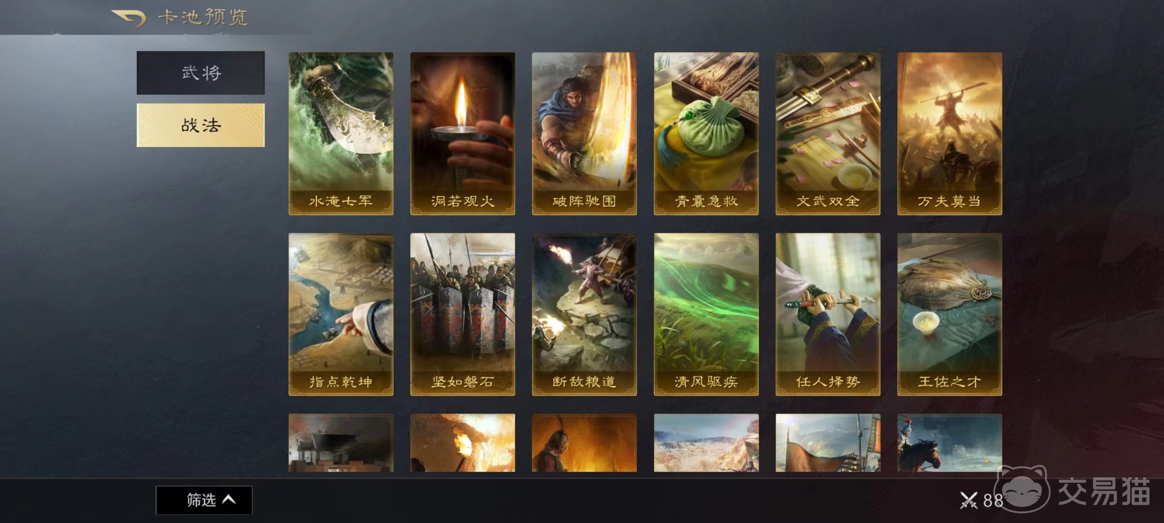 在游戏中还会开放一些限定卡池,从中增加一些武将或战法获取几率,大家如果有特别想要进行进阶的战法,可以等到相应卡池开放的时候再进行抽取。限定卡池中不仅出现的几率高,而且出现无用战法或武将几率也会降低,所以是很多玩家都期待的项目。日常多准备一些求贤令积攒起来,等到需要时直接拿出来使用。战法进阶之后提升效果非常明显,无论是增加属性还是产生效果,都会有很明显提升。