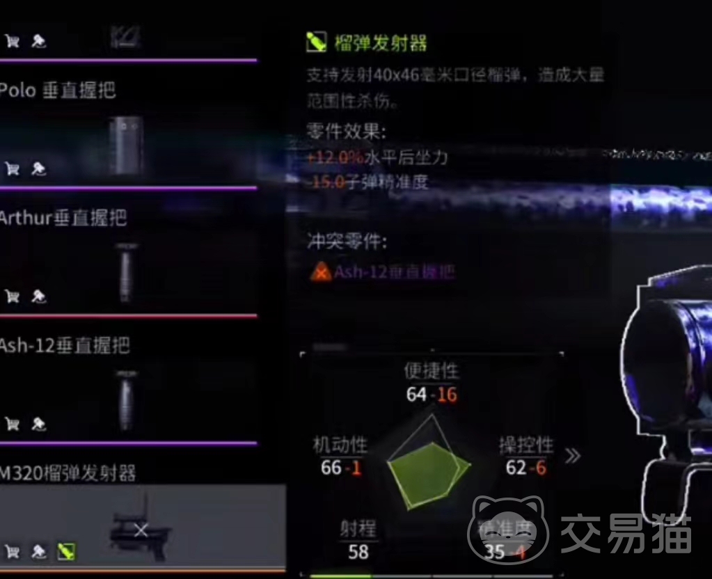 购买到基础款榴弹枪后再给其安上M320榴弹发射器就可以成功的发射榴弹了,M320也属于握把配件,所以装配了M320榴弹发射器以后就不可以配戴其它配件了。