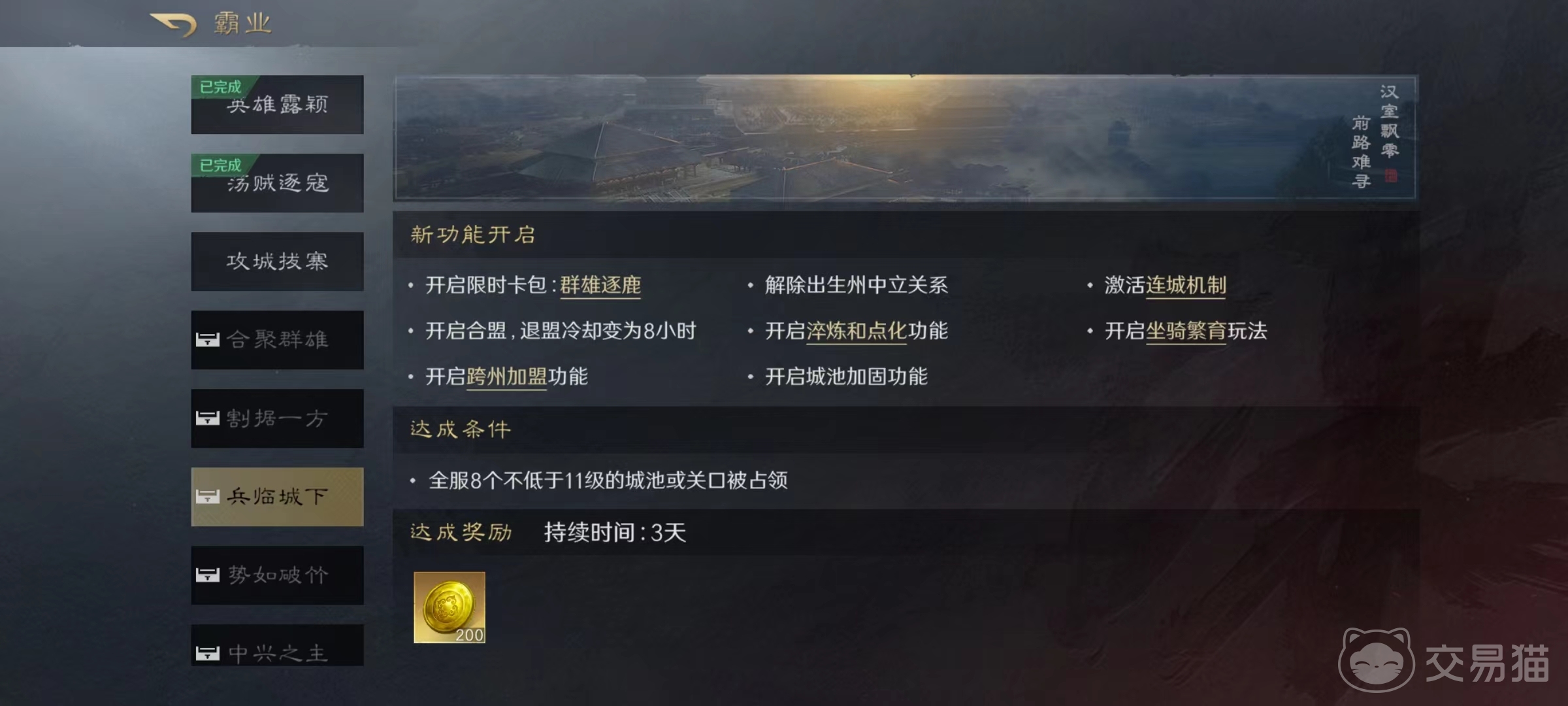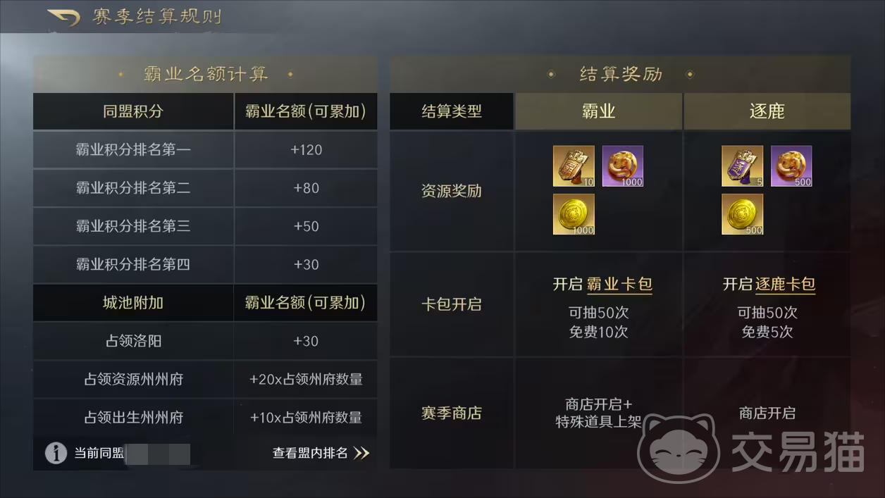 只有获得名额的玩家才能获得相应的结算奖励,开启最后奖励霸业卡包,如果没有获得名额,只能去获得逐鹿奖励,那么就差了很多,所以名额非常重要。在一个赛季结束后,将会根据玩家所在同盟占领城池进行积分结算,城池等级不同,积分也不同,例如占领了10级城市就可以获得90积分,占领8级就只有30点。然后根据总体积分进行一次排名,这一次排名就将影响到名额确定和分配。