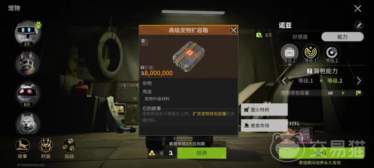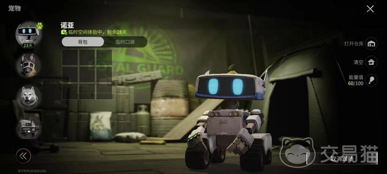 玩家如果想要获取宠物的话,玩家可以多参与一些活动,就有可能得到诺亚,如果有条件也可以直接去商店购买,诺亚有一个在探索地图的时候特别好的技能,那就是自动寻物技能,只需要使用这个技能,就可以自动在某些区域里面去探寻各种各样的物资,还会有一个临时的储存空间来将搜寻到的所有物资放在里面。