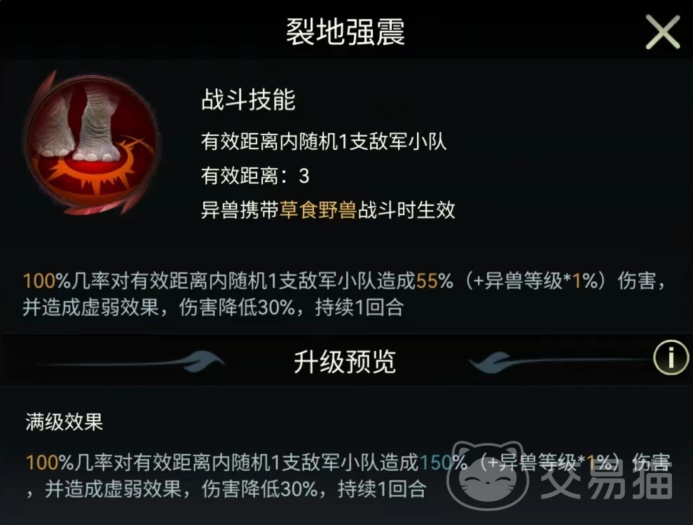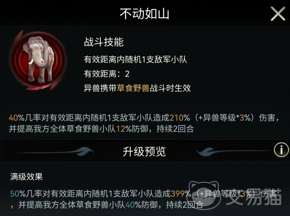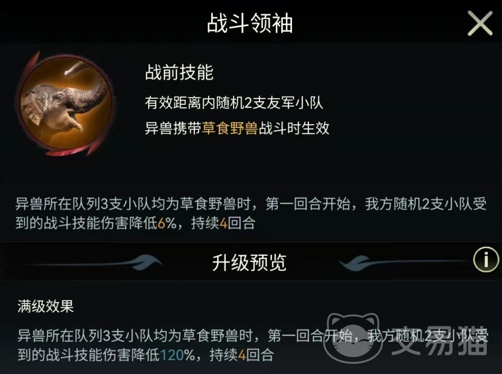 最后介绍的是印度象的三个独特技能,可以在战斗中生效,分别是裂地强震,不动如山和战斗领袖。裂地强震攻击距离为三格,有100%几率对随机一支敌方小队造成伤害,并使其陷入到虚弱状态。被虚弱之后,一个回合内输出的伤害降低30%。伤害比较一般,但是造成的虚弱可以限制对方输出。不动如山有效距离两格,有50%几率对随机目标释放,造成一次较高的伤害,并提高我高全体草食野兽40%防御属性,持续两个回合。最后的战斗领袖也是对草食类野兽生效,会随机选择两个目标降低受到的伤害。