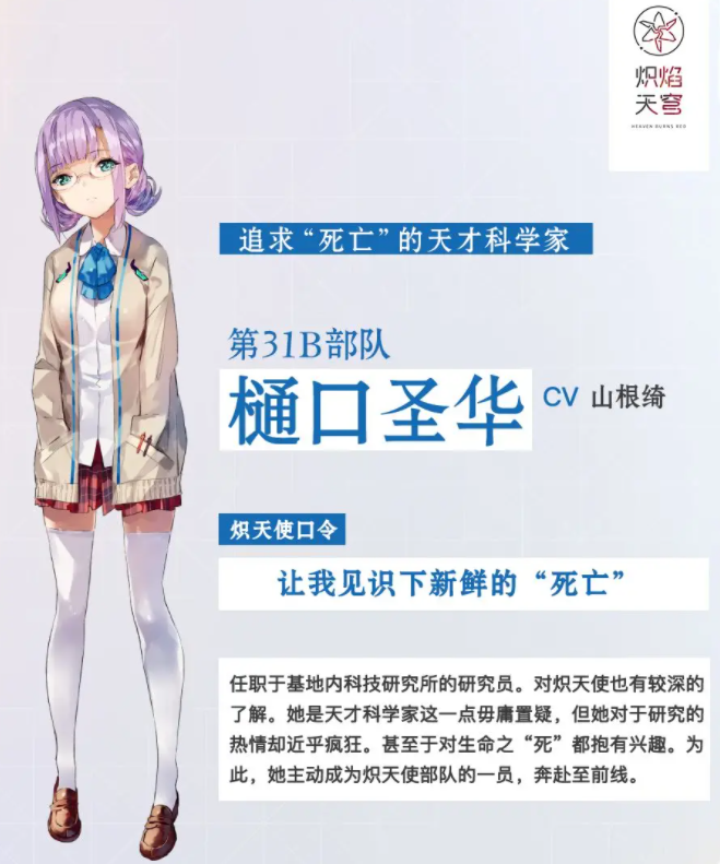 樋口圣华是追求死亡艺术的天才科学家,对着生命科学研究抱有疯狂的热情,因此加入了前线作战,隶属团队31b。在游戏内,樋口圣华有一张初始a卡,一张s卡,两张ss卡,均为突属性,接下来小编给各位玩家介绍详细的技能效果与强度。