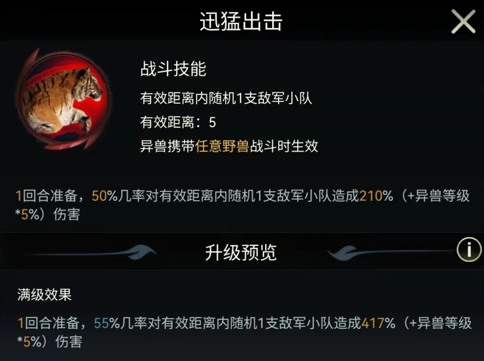 凶猛爪击有效距离更远,五格,满级有80%几率随机选择两个敌方目标造成伤害,该技能虽然在伤害数值方面比血盆大口要低一些,但是发动机率高,而且生效距离远。迅猛突击要一回合准备后释放,55%几率随机选择一个敌方目标造成一次高额伤害。单从伤害数值来看,该技能是最高的,但只能选择一个目标,如果能够伤害到敌方后排,那么给对方绝对是沉重的打击。