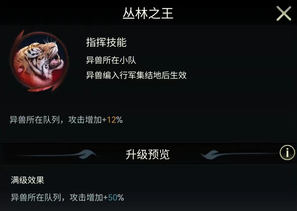 除了伤害技能方面非常犀利之外,其他增益类技能也很突出。三级统统治力和其他的异兽相同,这里不再介绍。自己所携带的高级攻击和高级防御,可以分别提升55%防御以及攻击属性,这点方面并不属于很出色的一类。但自身还有丛林之王这一项特殊技能,使其所在队列攻击力增加50%。这就属于非常顶级的增益类技能,让整个小队输出都能大幅度提升。西伯利亚虎的群落领袖技能,可以大幅度增加所在小队的攻击、防御以及普攻伤害。