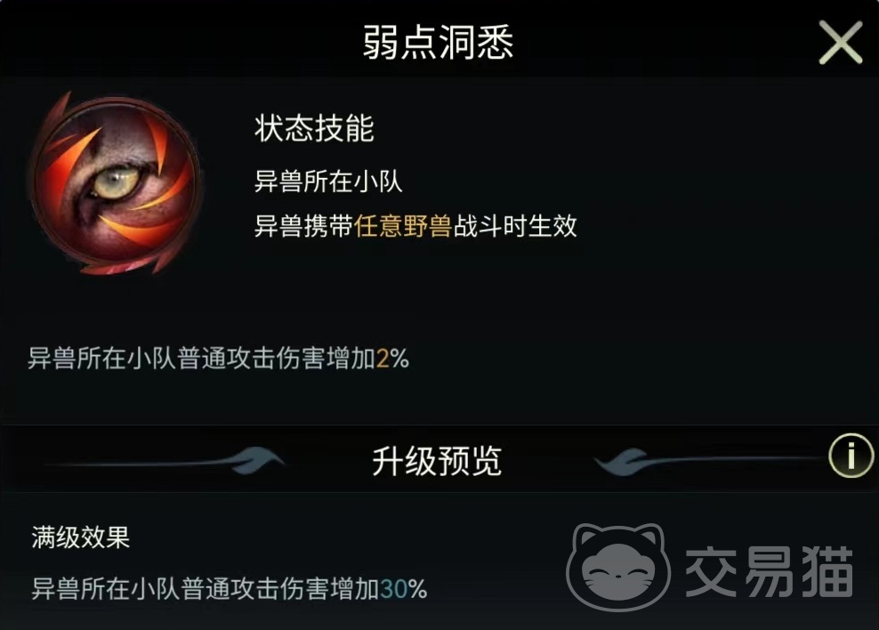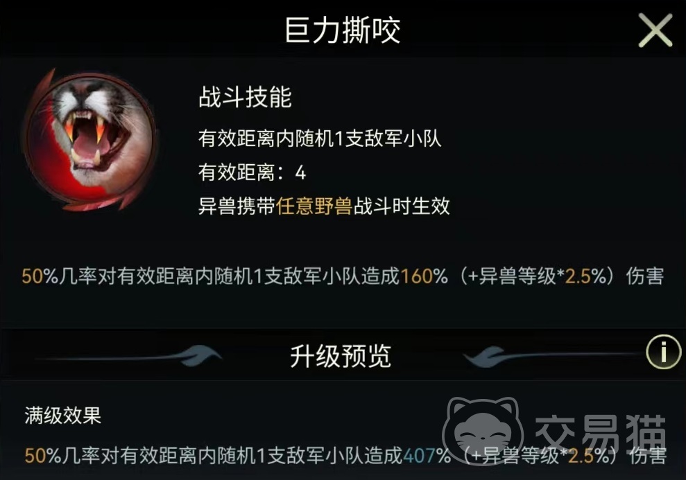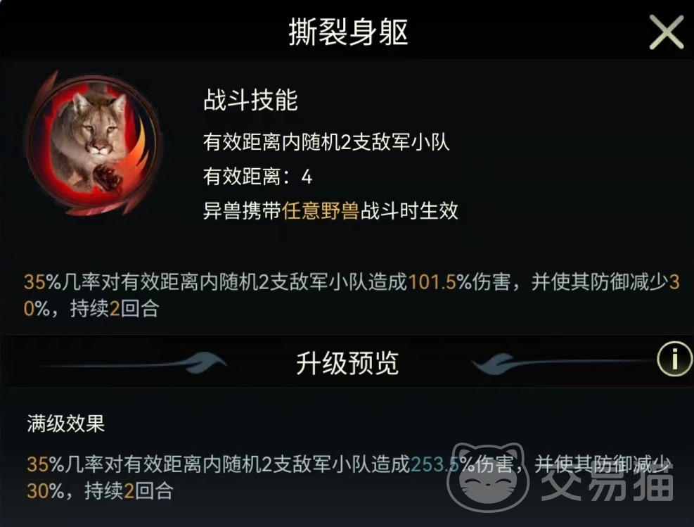 美洲狮作为一名可以适用于各个场合的通用型异兽,是很多玩家都期待获得的,它可以适合很多不同搭配方法。作为战斗型异兽,自然也具有相应的输出技能,主要包括两个。巨力撕咬技能有四格有效距离,在达到满级时,有百分之五十几率发动,对距离内随机一支敌军小队造成高额伤害。撕裂身躯同样是四格有效距离,达到满级时有35%几率发动,在有效距离内随机选择两个目标造成伤害,并降低其30%防御,持续两个回合。