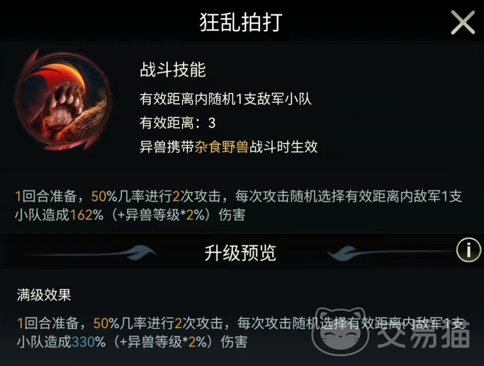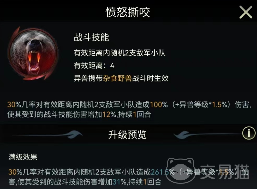 它还拥有三个自身专属的战斗技能,分别是愤怒撕咬、野兽威慑和狂乱拍打。愤怒撕咬有效攻击距离为4格,需要携带杂食性野兽战斗才能生效。在达到满级时有百分之三十几率随机选择两支敌方小队造成伤害,并使其接下来受到的战斗技能伤害增加31%,持续一回合。这也就意味着在该技能使用之后,后续可以直接集火。野兽威慑不属于伤害类型,而是一种状态,在战斗开始的前四回合,敌方随机两支小队造成的战斗技能伤害降低,满级时可以削弱35%的伤害值,这就限制了对方战斗输出,也是美洲黑熊很独特的一点。