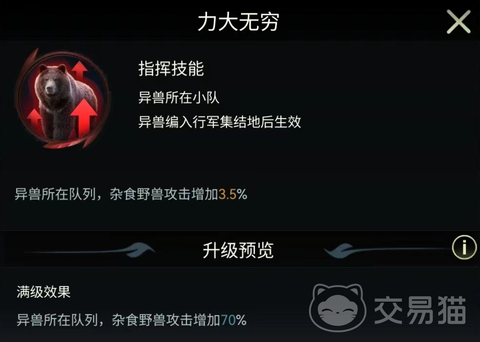 看到这里大家认为野兽领主新世界美洲黑熊技能好用吗,无论从对小队野兽加成状况,还是对自身各种技能来看,这都是目前比较核心的异兽之一。如果大家可以抽取到建议重点培养起来,尤其是自身三个战斗技能都很有特点。