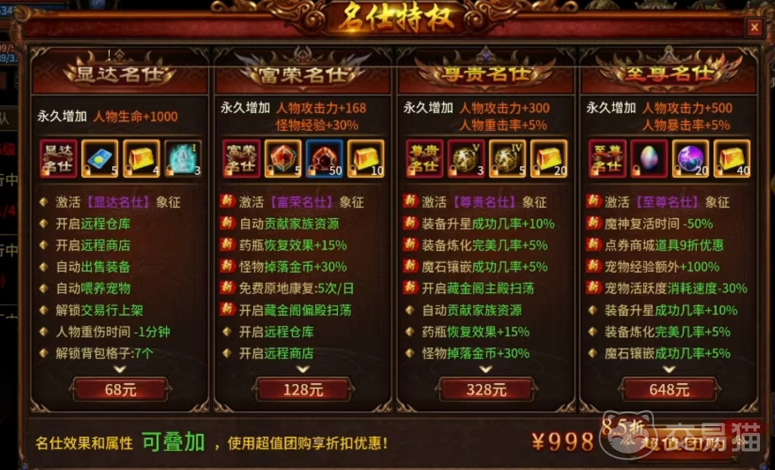 目前一共提供了4种不同特权和称号供大家选择,最初的是显达名仕,后续为富荣名仕,尊贵名仕和至尊名仕。显达名仕需要充值68元后获得,能永久增加1000点人物血量,开启远程仓库,远程商店,可以自动出售装备,喂养宠物,能在交易行上架,还会解锁更多背包格子。充值128元将激活富荣名仕,永久增加人物168点攻击力,以及30%打怪物经验,还将自动进行家族资源贡献,使用药水恢复效果提升,打怪掉落金币提升,给予每天5次原地健康复活的机会,同时开启藏经阁偏殿扫荡。