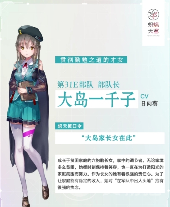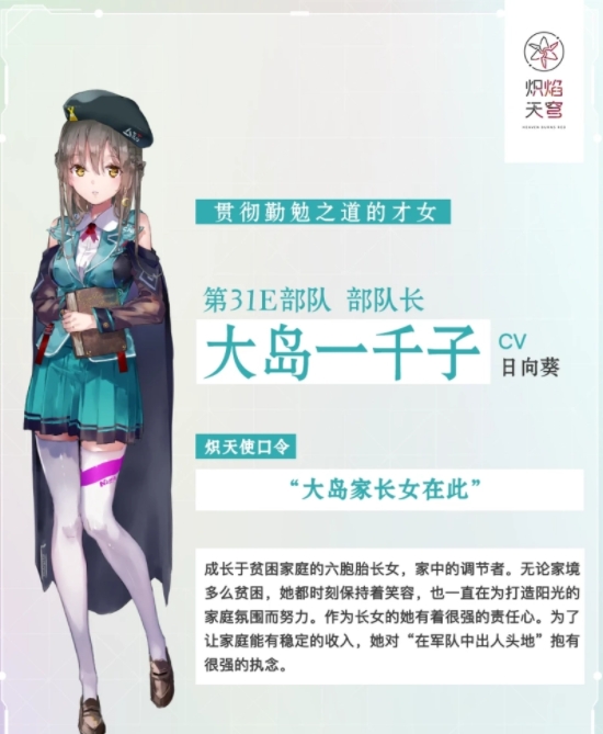 大岛一千子是一个努力型的天才,在贫穷的家庭中长大,作为家庭中的大女儿,她承担着一家之主的责任,虽然家庭很贫穷,但是她却很是乐观开朗,作为31E部队的队长,她的责任感很强。这个角色拥有强大的输出防御能力,元素属性为火,武器属性为打,可以快速的对敌方造成一定的攻击。