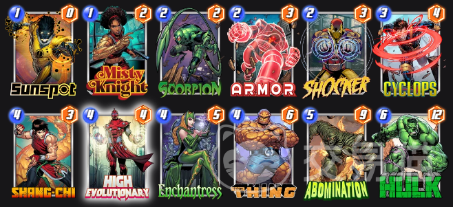 对至高进化这张卡来说,己方卡牌里没有效果的白板越多,他能发挥的威力也越强,而以上这些卡牌都是没有效果的,其中也不乏一些战斗力很强的卡,例如12点攻击的浩克,一旦他被施加上减少能耗或者增加战力的效果,他的战斗力将会再度提升一个层次,大家在摆放他们的时候可以有意识地将他们分开一下,以控制更多区域的优势。