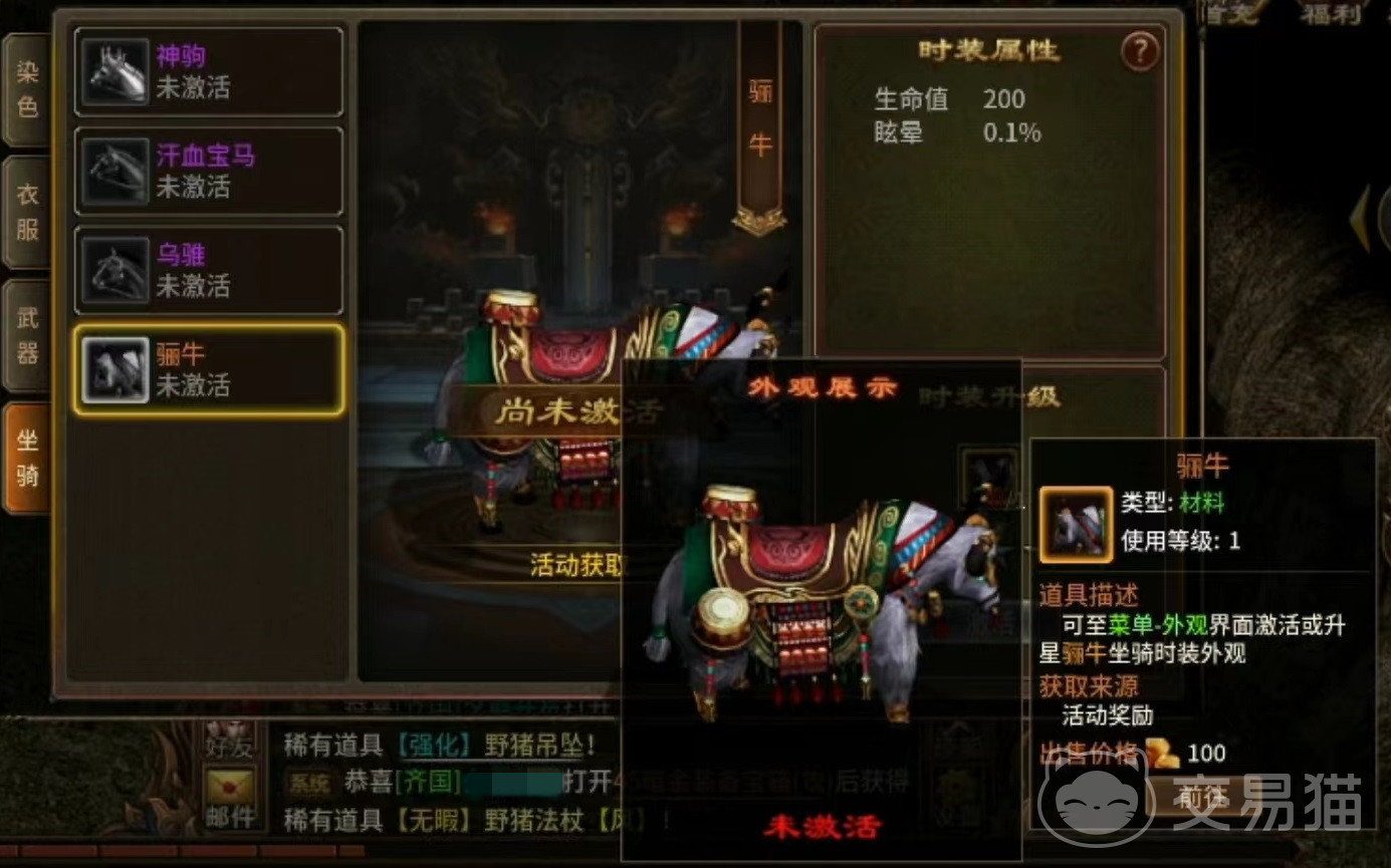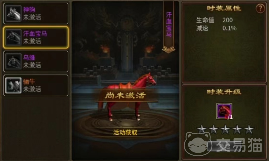 坐骑包括神驹,汗血宝马,乌骓和骊牛这几项,神驹是通过商城购买得到探,汗血宝马是活动获得,乌骓比较特殊,是达到一定的军衔之后给予玩家的奖励,最后的骊牛也是活动得到。这些外观都是可以附加一定的属性,品质越高附加也就越多。例如神驹可以增加玩家100点生命值和两点恢复,汗血宝马可以增加200点生命值和0.1%的减速。
