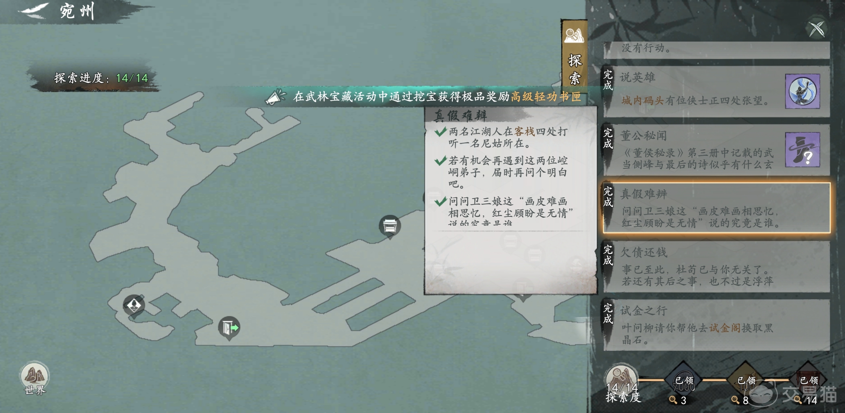 以上就是墨剑江湖宛州城过关流程的所有内容了,有一些任务需要注意时间,大家要等待一段时间,甚是是到转天才能触发后续内容。每个探索任务都是不同的小故事,玩起来还是挺有意思的,大家快按照小编的攻略去通关吧!