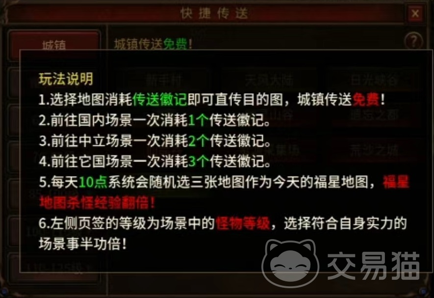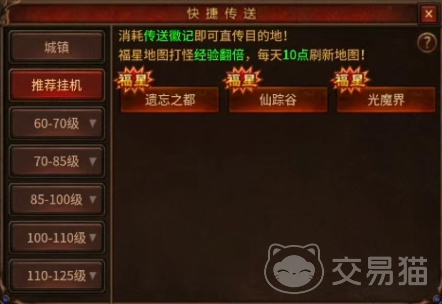 但如果在没有任务需求的情况下,如果想要直接达到指定地点,那么就需要利用快捷传送功能。在主页面右边可以找到传送选项,点击之后这里有目前所有对应场景,分别是城镇、推荐挂机、60~70级,70~75级等不同分类。大家可以从中查找到自己想要去的地方,其中城镇又包括新手村,天风大陆,幽灵大陆,荒沙之城等,点击之后直接就能传送过去,当然也需要消耗道具。
