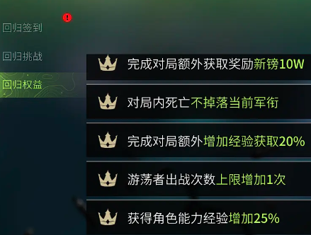 还有回归挑战可以来获得,完成相关的任务就可以获得对应的道具和货币的奖励,游戏中提供给大家获得资源的渠道是非常多的,除此之外,还有回归的权益可以来解锁,来激发玩家们能动性,来更好的吸引玩家们的加入,也能够留住老玩家,白嫖一些珍贵的道具。