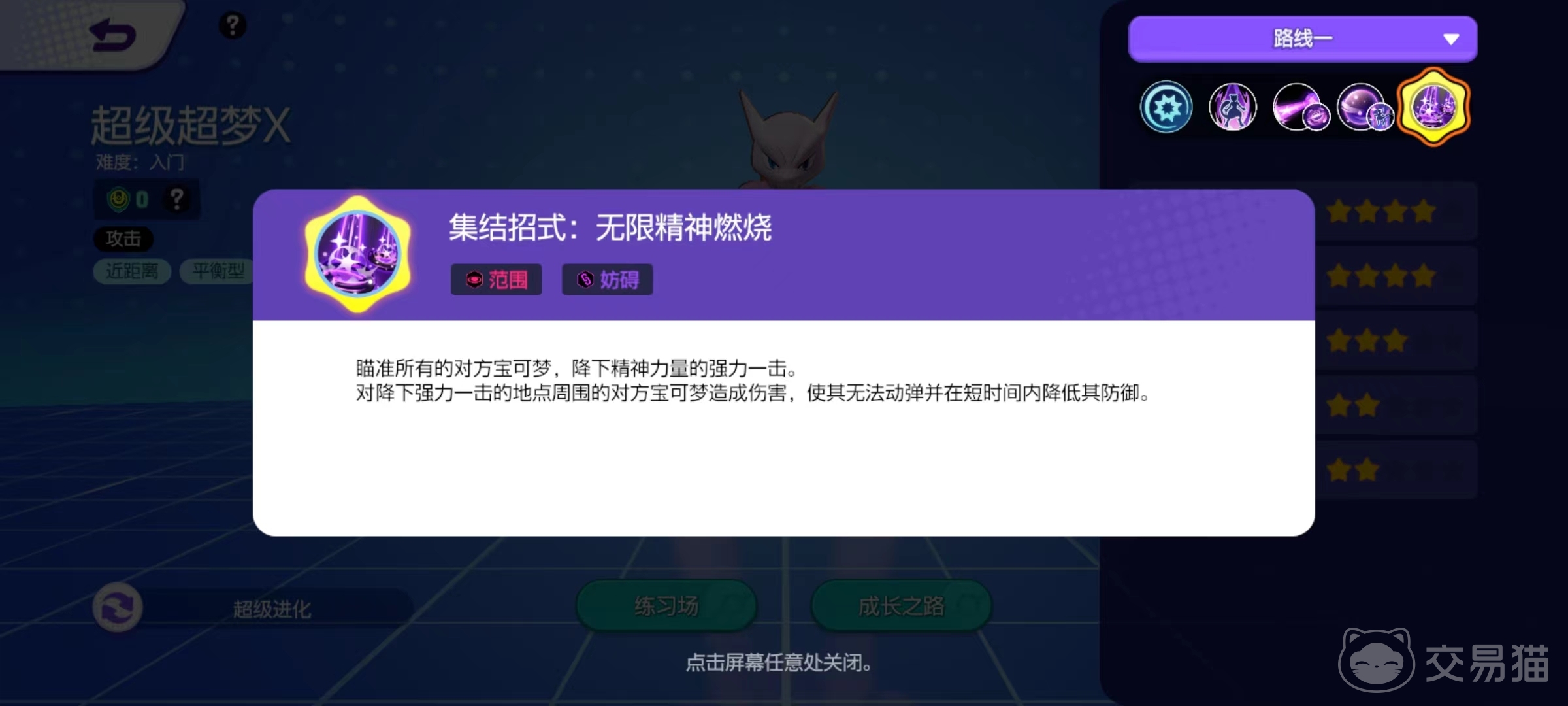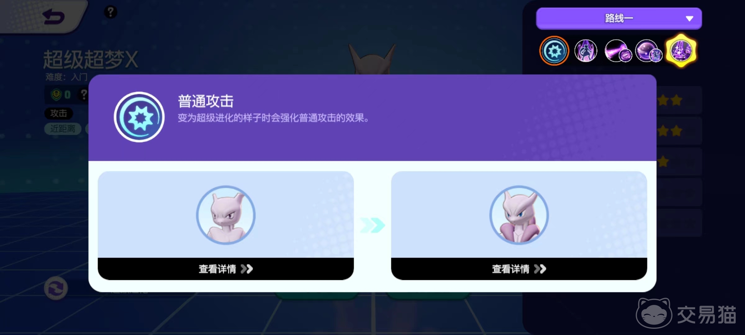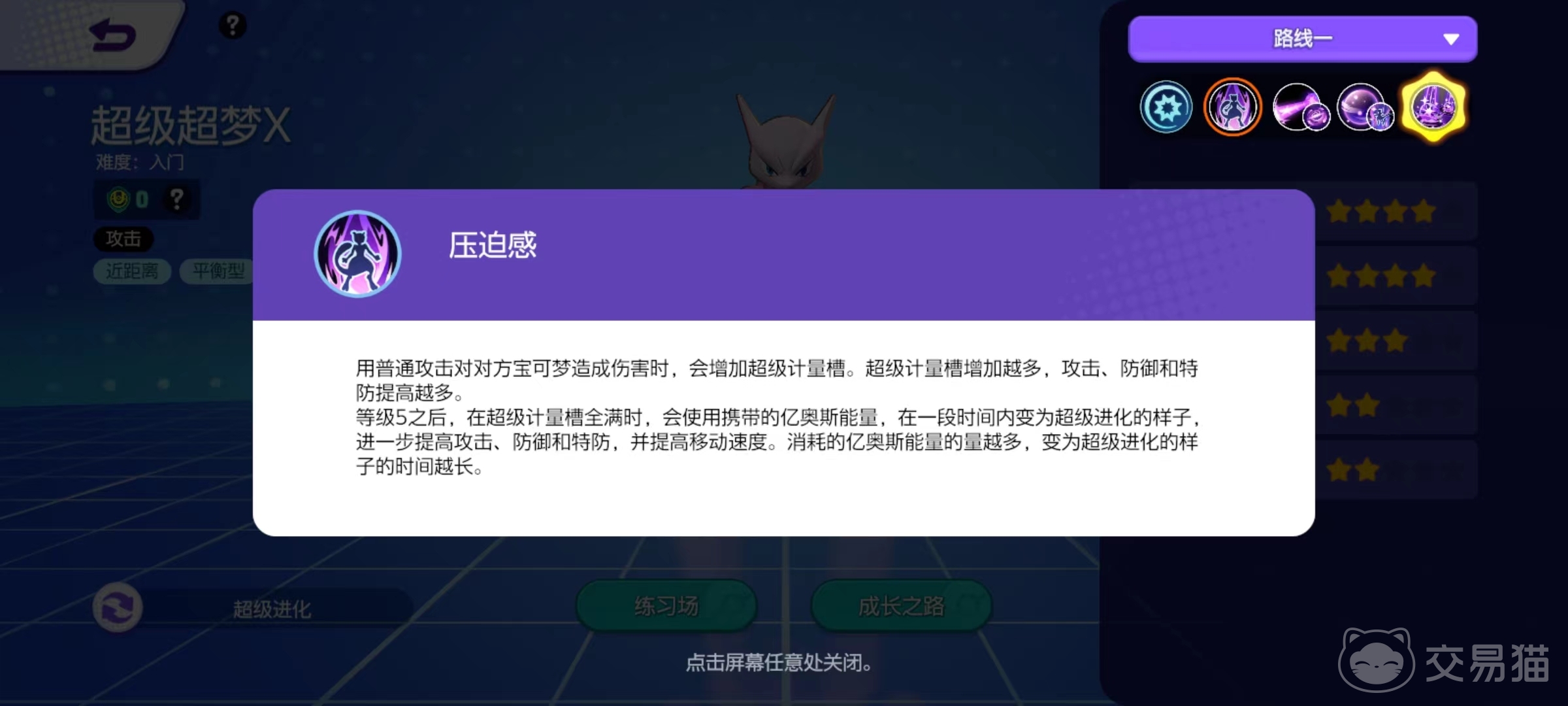 超梦在战斗中可以通过一定的手段进行超进化,如果是近距离平衡型的超梦,则进化成超级超梦X,如果是远距离攻击型的超梦,就进化成了超级超梦Y。但无论是哪一种,在操作方面都是相同的,那就是要依赖自己的一技能压迫感。实战过程中,通过使用普通攻击方式,对敌方角色造成伤害,就会累积超梦自身能量槽。能量槽累积越多,自身防御、攻击和特殊防御等属性也会相应提升。