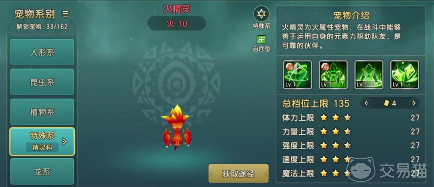 魔力宝贝:复兴中宠物有不同的系别,那么首先目前最强的一个就是回复系精灵,属于特殊系别里的精灵科,精灵可以在战斗中利用自身的元素来帮助队友,精灵科中一共有四个不同属性,它们是目前版本中T0级别的宠物,这几个精灵强度非常不错,那么如何获取呢?在宠物商人那里进行稀有宠物花费金卡抽取。