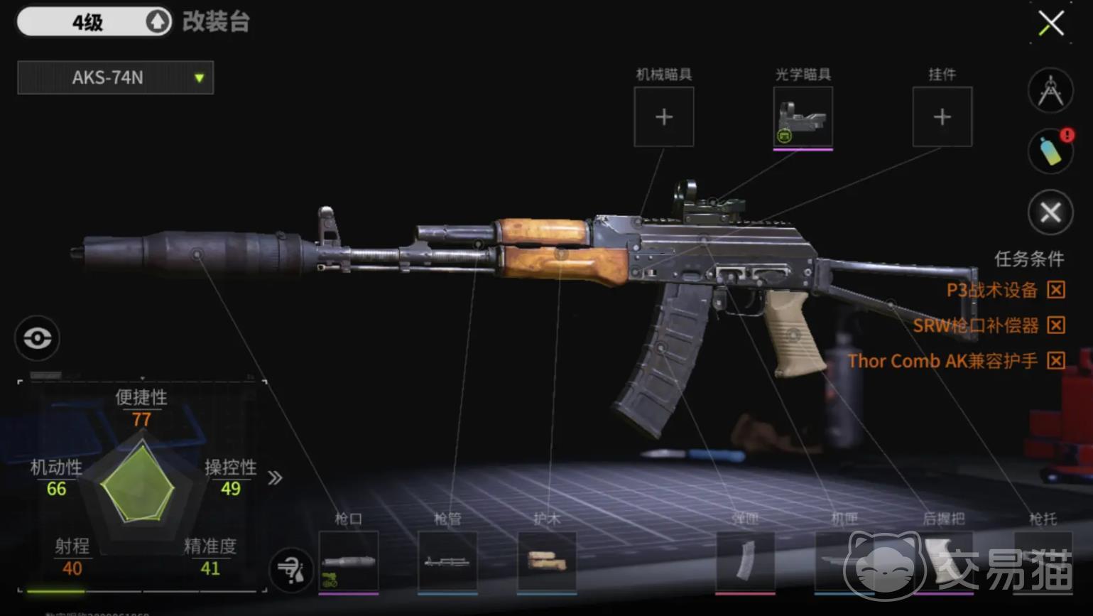 在武器选择方面,选择的范围就比较大了,如果近距离作战不开镜的话,那么AK就是不错的选择,可以选配一个MDR,可以带一个减后座的,增加移动速度回复耐力的配件也都是不错的。也可以选择冲锋枪,可以不开镜,将P0-配满的,开镜的话可以选vector或者mp5,根据自身开镜的情况进行平衡配件就好了,枪械还是要根据自身的手感去选的,然后注意最重要的配件就是枪口,可以从寄卖行买,然后进行改装。