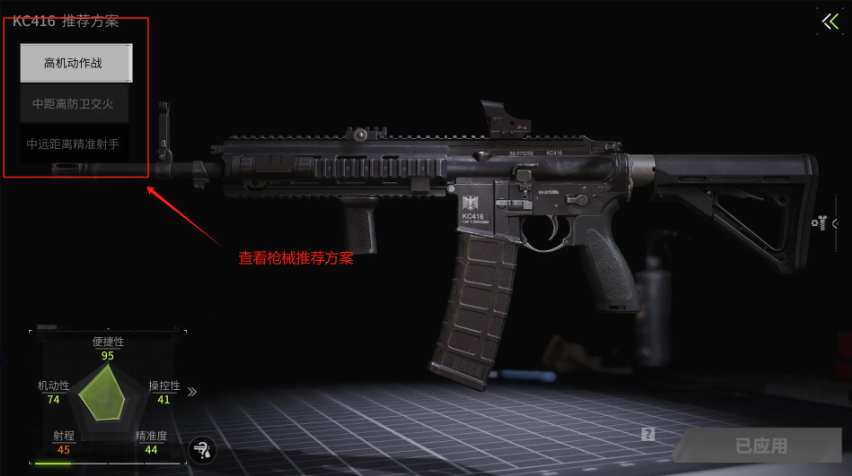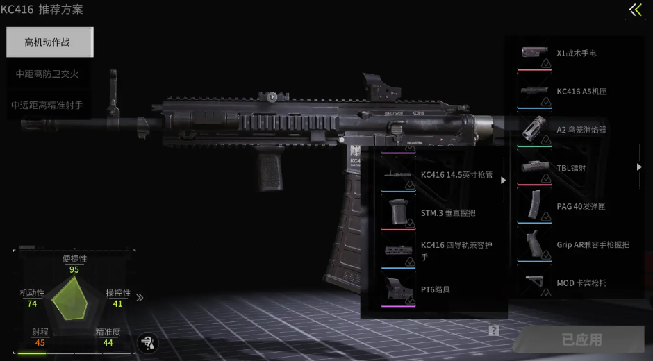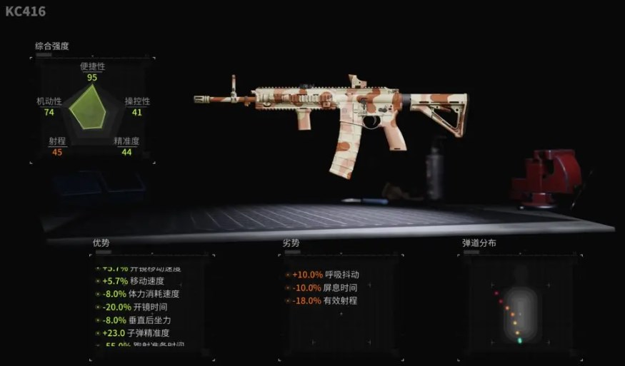 萤火突击里最常见的作战类型就是机动作战,不断变化位置来与对手对枪,可以从中近距离打击对手,而机动作战采用最多的就是步枪,以KC416为例,如果是打算在中距离作战就好就很需要移动属性,子弹的精准度,还有开镜时间,跑射的准备时间等,射程、抖动则不是那么的重要了,所以也不是特别需要屏息这个属性。