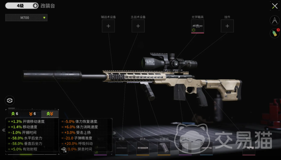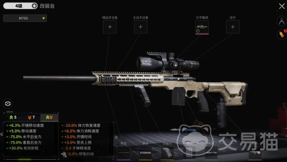 如果需要消音器的话,也可以选择蓝色的枪管,略微地牺牲一点点远距离伤害,从而大幅增加其隐蔽性,相对来说是生存更强的改装方案。此外,对于狙击枪来说瞄准镜也是非常重要的改装项目,不单单是倍率大小的问题,也会影响操作手感,所以瞄准属性高一点低一点是次要的,没闪光、或是有测距功能的会更好,大家可以在配好了之后再去靶场试一试手,直到拥有较好的手感为止。
