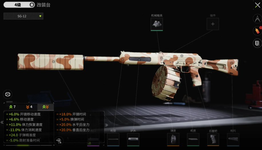 在一些室内地图作战或者是跑图争夺点位的排位赛玩法中,近距离冲脸是大家最常用的方案,冲锋枪和霰弹枪使用率较高。既然是冲脸了,那么机瞄就没那么重要了,可以舍弃一些精准度和开镜方面的属性,转而提升移速和耐力。以大家使用较多的SG12这把霰弹枪为例,配件方面可以选择体力恢复增强和移动速度提升,将机动性提升到极致,再配上这把枪的强大的近战威力,足以应付各种冲脸环境。