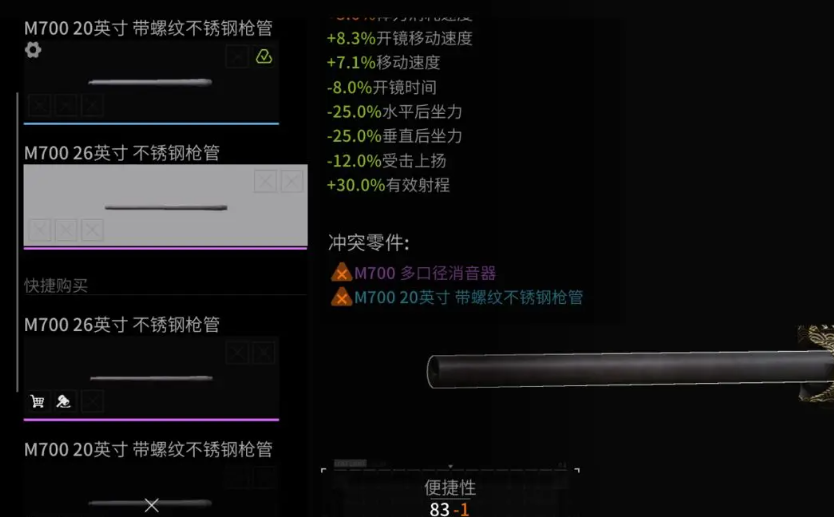 在给武器枪械选配件的时候需要注意部分武器之间会有冲突,也并不是武器品质等级越高就越好,部分枪管(例如上面提到的M700)蓝色品质的能带消音器而紫色的品质的则无法携带,这时就需要玩家在两种属性之间做出取舍了,这种不同配件之间的冲突设计,可以让玩家有更灵活的搭配,同时也避免一些超模的改装组合。