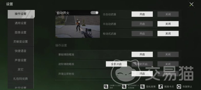 如图所示,辅助瞄准在设置选项中最上方“操作设置”里,选择“基础辅助瞄准”,点击左边就可以开启。辅助瞄准配上自动开火,基本上就可以完成自瞄了,对于刚上手的新人来说至少不会出现敌人出现不知道向哪儿开火的情况。