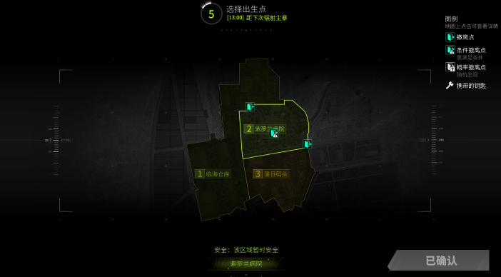 枪械就携带MP5、或者AK74M等冲锋枪,防具方面选择艾丽莎3级或4级护甲,消耗品可以携带CS瓦斯弹,钥匙方面可以携带紫罗兰病院内的所有钥匙,因为数量比较多建议大家再带个卡包,紫罗兰病院一共有三个不同的撤离点,分别是花园的上方、车道的角落和病院的中间,如果遇到危险一定要及时撤离。