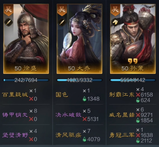 但是有的玩家说,上面推荐的很多武将对于平民来说很难获得,那么接下来小编推荐的第二队是首充就能玩的队伍。就是孙策、徐盛、大乔。相信如果有积极参加三谋活动的小伙伴们,肯定都有这三个武将吧。孙策虽然是签到获得的武将,但是他的伤害却是十分高的,属于输出武将中比较前列的武将。而徐盛虽然是开局就送的武将,但同样是有比较高的抗伤能力的。大乔则是优质的辅助位,只需首充6元即可获得。这样一套阵容,虽然看上去十分廉价,但是打起架来强度却不俗。