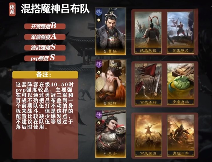 第一个队伍是吕布、貂蝉、曹操。这是一个比较均衡的队伍,在整个三谋中,如果要选一个英雄来抗伤害,那么我会选择曹操,曹操高额的统率搭配上合适的技能的话,对手拿他根本没有办法。而输出位,我们给到三国第一猛将吕布。貂蝉则是一个既能抗伤害,又能打部分输出的角色。这套阵容不管是碰上物理队还是法系队,都是优势方。