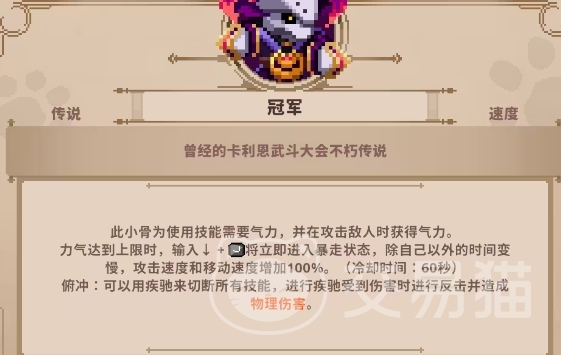 冠军很难获得,也属于传说级的头骨,尽管得到难度略逊于死神和夜叉,但也是需要大量的时间和精力去获得。稀缺独特的制度进而在游戏中占据无可替代的地位。是头骨的速率类型,玩家装备后,使用技能会消耗气力值。同时,在攻击敌人时也能获得能量值。该机制促进玩家在战斗中均衡使用技能和攻击频次,提高游戏策略。当气力值达到限定时,玩家能够进入暴走状态。在暴走状况下,玩家的攻速和伤害将大大提高,冠军魔骨的优点显而易见,暴走状态下不仅能让玩家在短期内展现出巨大的战斗力,还能关键时刻扭转战局。