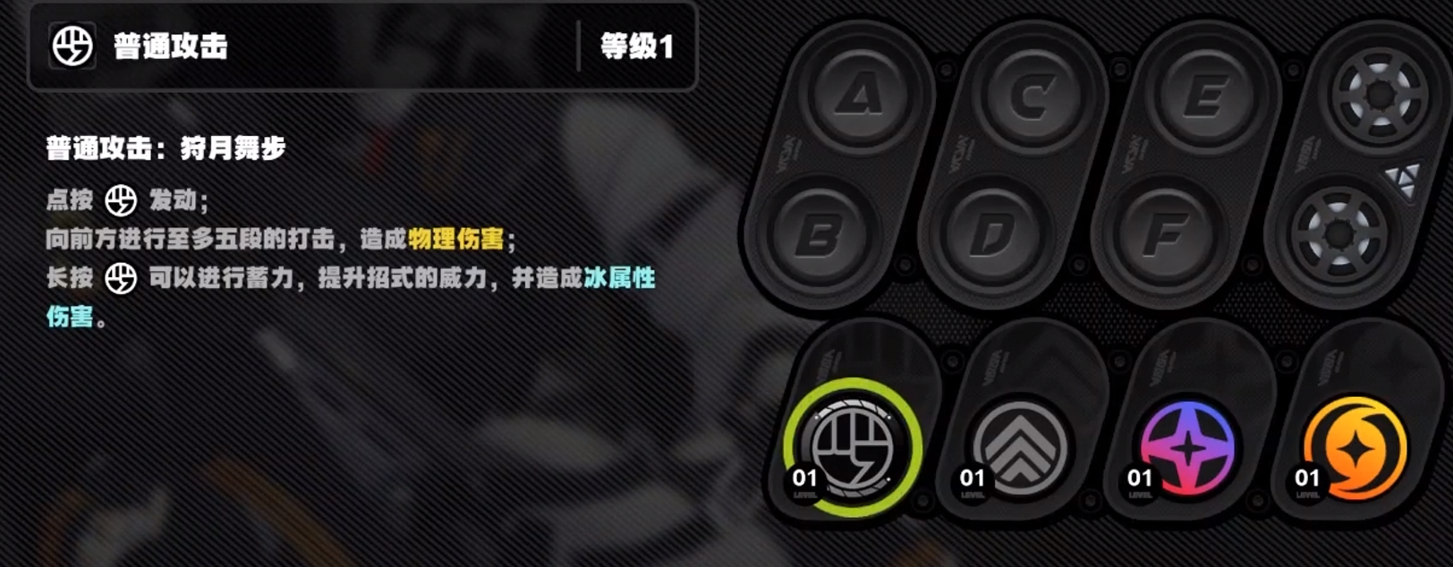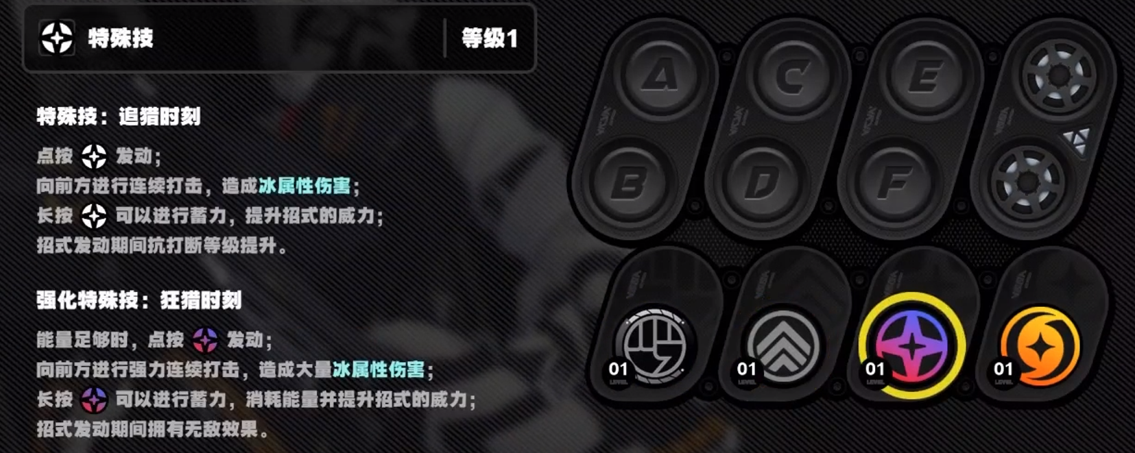 特殊技能分为两个方面,第1个方面是强化技能效果能够持续的对前方进行连续攻击并造成大量的冰属性伤害,在长按蓄力的同时角色能够获得无敌霸体的效果,整体的实力会有质的飞跃。特殊技最主要的是对普攻的强化并蓄力叠加并且发动的期间抗打等级提高。