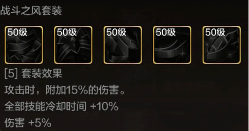【战斗之风 套装】:这是一个套装,在挑选这一个套装后,一旦在攻击时可以得到15%的附加伤害,另外还能获得10%的技能冷却时间以及5%的伤害。