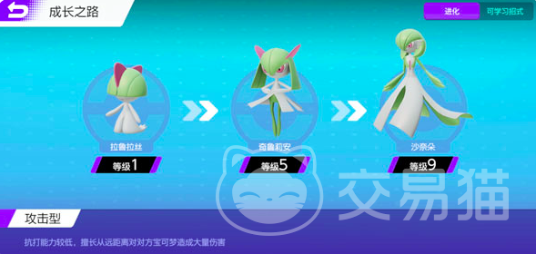 我们先来看看莎奈朵这只宝可梦的成长阶段,其实它的最高等级可以升至九级,由拉鲁拉斯进化成齐鲁莉安,再由齐鲁莉安升级为沙奈朵,这一进化模式玩家可以通过经验积累来快速实现,目前在游戏当中他的抗打能力比较低,主要还是擅长对远距离的宝可梦进行大量伤害,所以对于不少喜欢远距离作战的玩家们来说成为了不二之选。