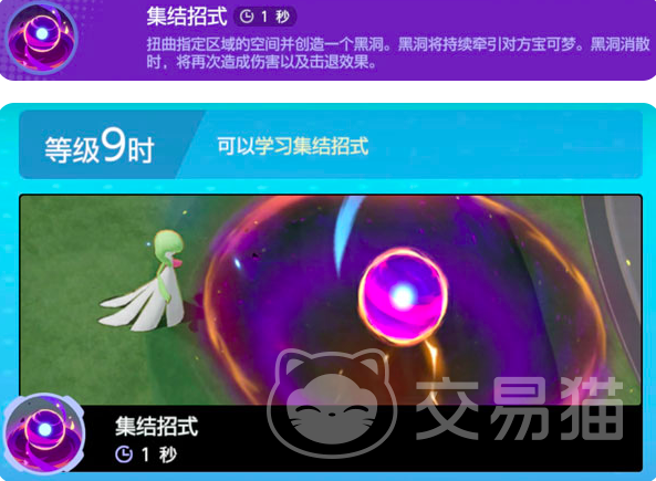 而当沙奈朵达到九级后则可以开始学习集结招式,也就是说在一定区域内它可以打造出一个黑洞,黑洞将持续牵引着对方的宝可梦。而当黑洞散去后,将会再次造成伤害,并且达到一定的击退效果。除此之外还可以开启被动技能同步,也就是说每隔一段时间,当该宝可梦精灵受到减速和持续性伤害时,施加者也同样会陷入到同样的状态里。