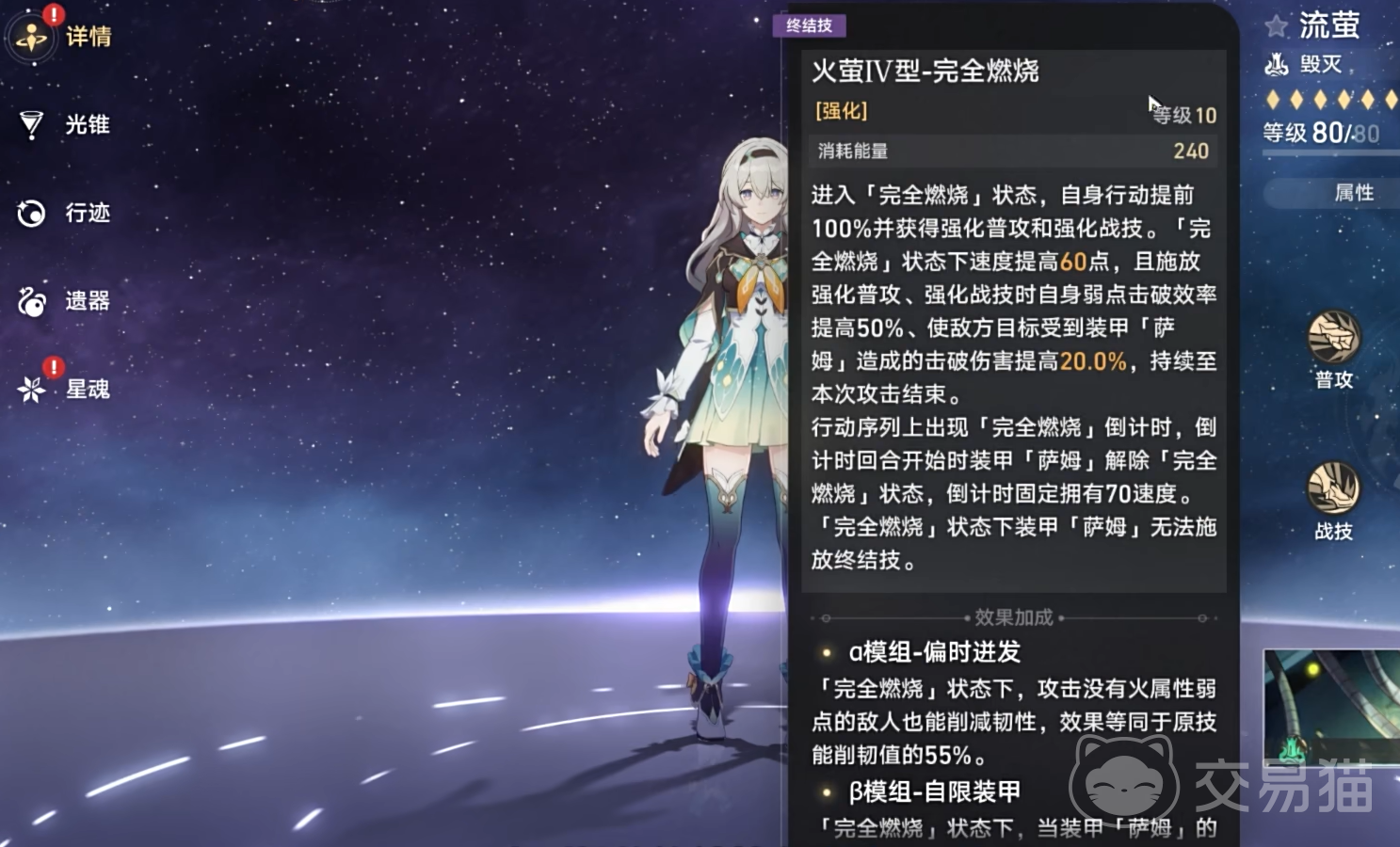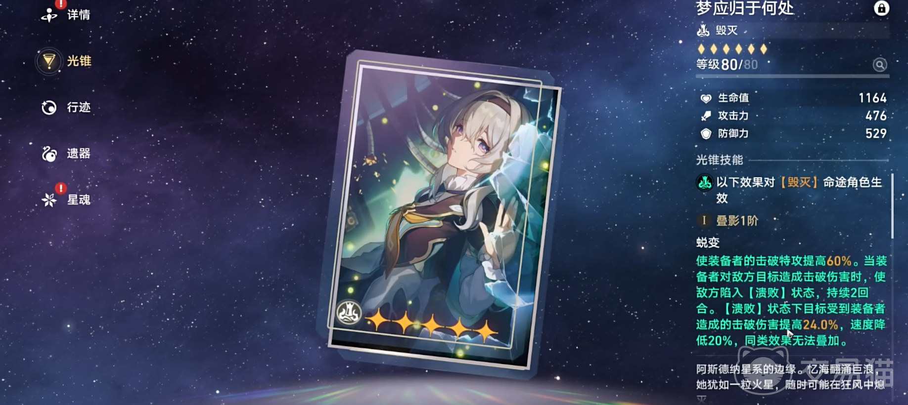 流萤作为击破流的主要输出角色,她的光锥效果也全部都与击破相关,在流萤装备了专武的情况下角色的击破特攻可以提高60%而流萤作为依靠击破特攻输出的角色,这个效果能让玩家的伤害数值提高一个挡位,同时在专武中还有一个效果特别适合流萤。