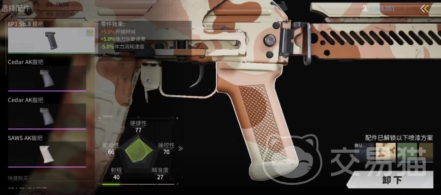 后握把采用Sb.8来提升跑图的效率,机匣也采用原装的,更不用什么瞄准镜,直接用腰射就可以了。弹匣的话则需要注重一点,可以采用40发的扩容弹匣。前握把用性价比超高的CTE,这个紫色品质的三角握把不仅便宜,还可以提供很多的后坐力衰减,负面效果也少。