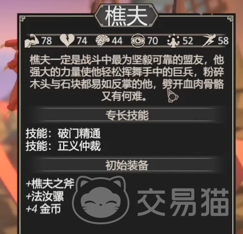 樵夫,这个角色在游戏中扮演着既能扛伤又有不俗输出的角色。玩家在完成任意一局游戏后,只需消耗18点学时点数即可拥有他。在所有可选人物里,他的基础力量属性相当出色,比角斗士和铁匠还要高出两点,生命值也相当可观。尽管他的移动速度略显缓慢,但战斗意识颇为不错,更偏向于输出型定位。