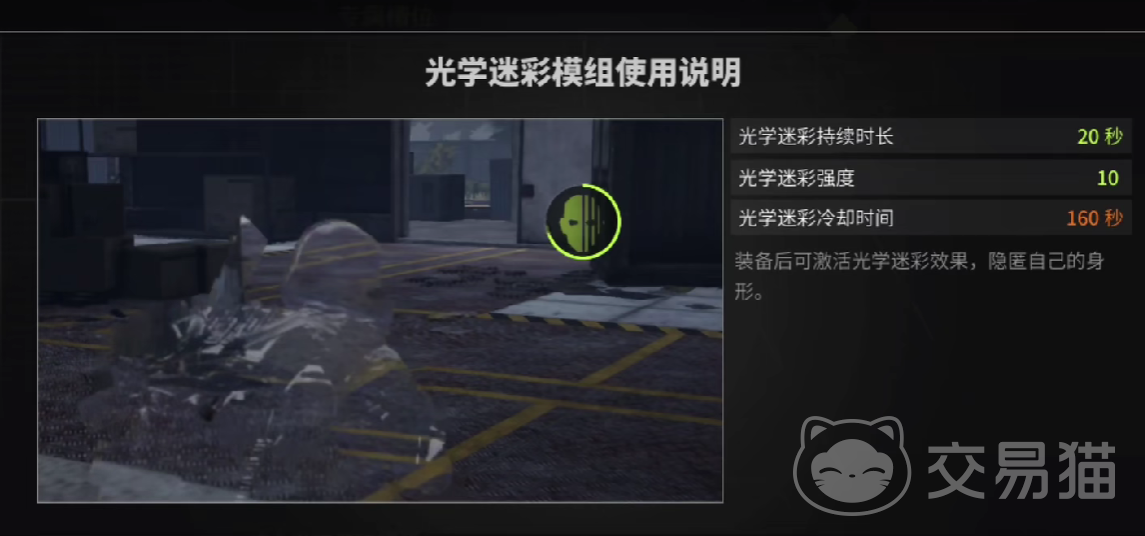 玩家在使用光学迷彩模组的时候可以携带爱丽丝这个宠物作为自己的战备,爱丽丝可以自动的锁定敌人位置,并且给敌人打上标记,非常适合玩家在光学迷彩状态下视线被扭曲的情况,不仅如此爱丽丝还可以为玩家提供6x6的背包格数哦!