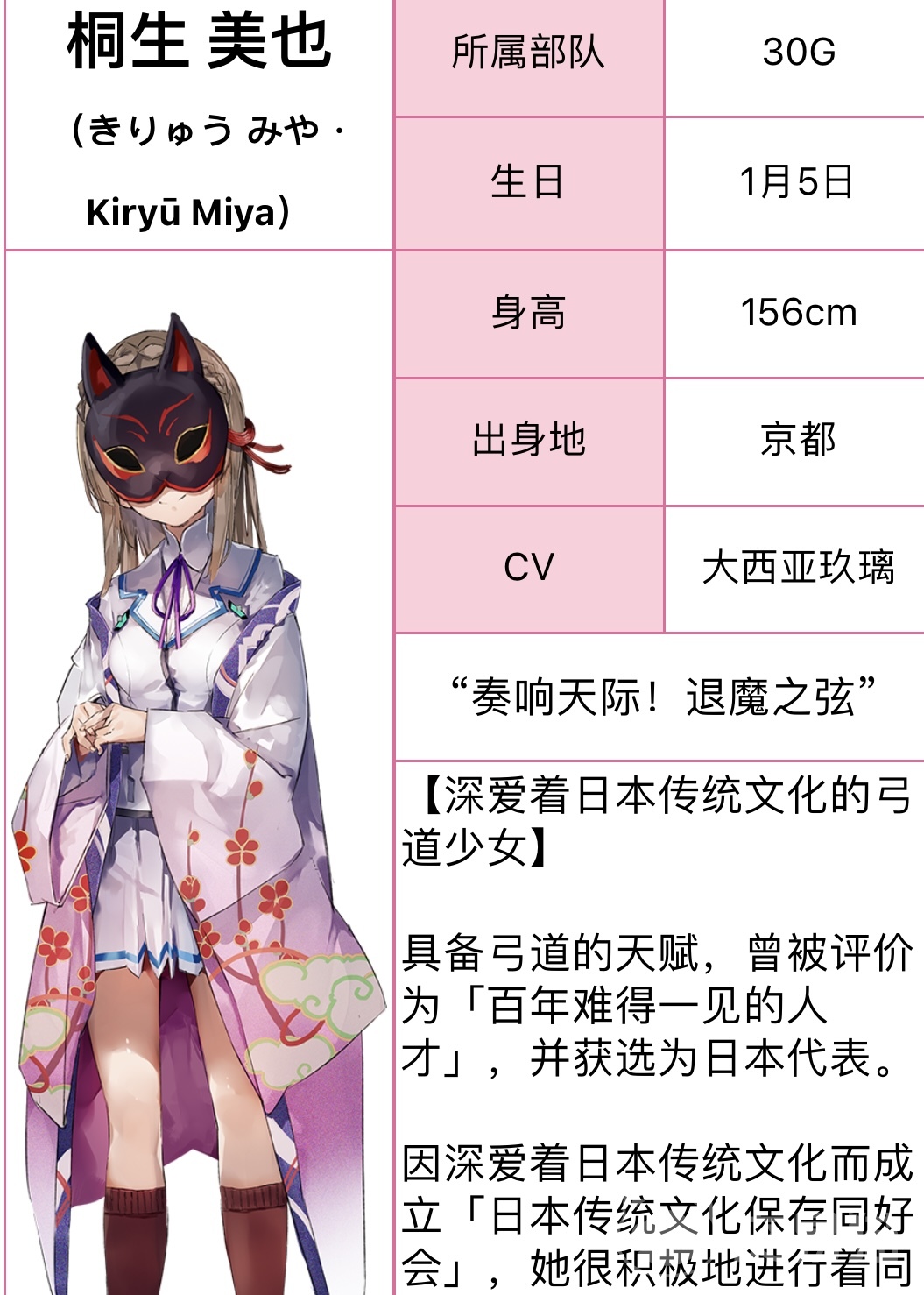 还有最后一个角色,就是桐生美也,这个角色是30g最后一个成员,出生于京都,在1月5号出生,身高为一米五六,它的外观设计非常具有日本传统的特色,身披的服装和面具都和日本文化类似,这个角色深爱着日本的传统文化,平时对待旁人也非常恭敬和温和,对待开展的活动也比较积极,还拥有不同类型的机甲可以选择。