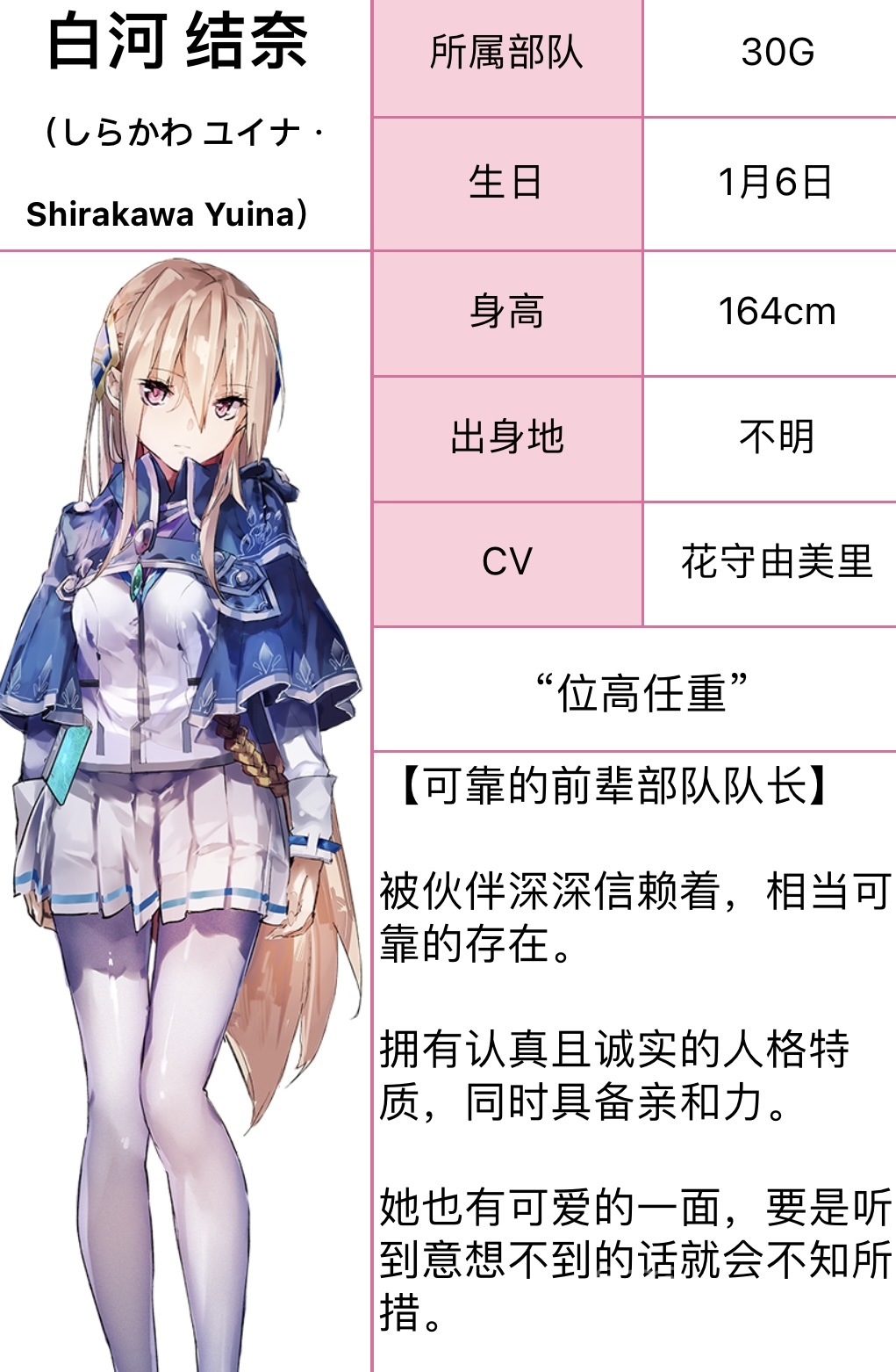 首先第一个要介绍的就是白河结奈,这个角色身高是一米六四,整个外形都是非常卡通可爱的,主要由花守由美里来配音,非常吸引人的耳球,作为1月6号出生的角色,他在队伍中的形象是非常可靠的,被很多玩家们深深的信赖着,并且游戏中的性格也非常的真诚,具有亲和力,整个人设设计的非常完美。