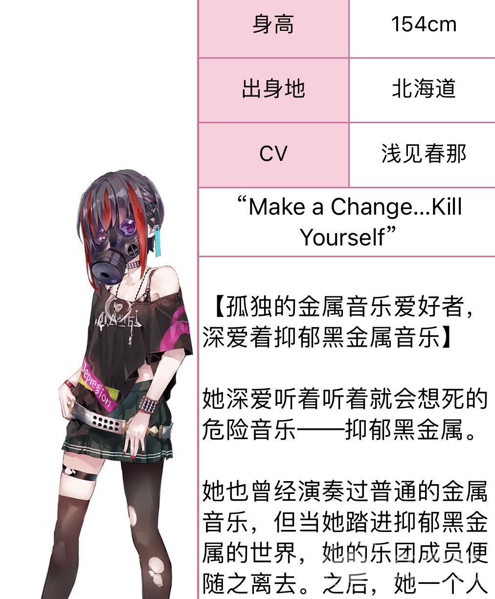 命吹雪,这个角色是一个抑郁黑金属音乐的爱好者,非常喜欢听那些危险的音乐,出生于北海道,而室伏理沙,这个在5月23号出生于山口的角色,是部队中的大姐姐,散发着母性的光芒,包容能力非常强,能够宽恕一切,在游戏中,所有玩家在他面前心智都会变成幼儿。