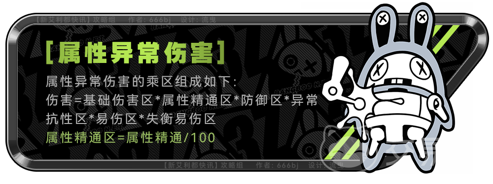 其次是属性异常伤害,属性异常伤害的组成是伤害=基础伤害区*属性精通区*防御区*异常抗性区*易伤区*失衡易伤区,如果对敌人的属性伤害时就会触发对应属性的异常积蓄,如灼烧、感电、侵蚀等。