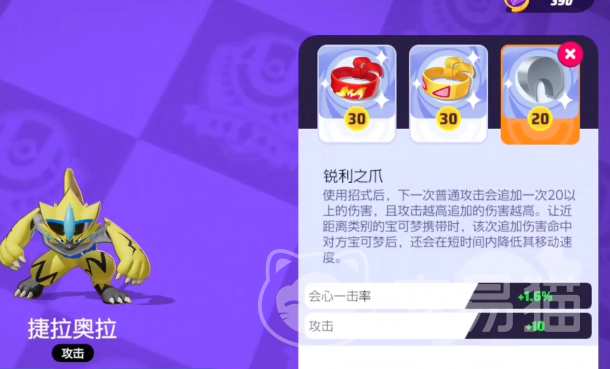 在游戏里捷拉奥拉是一个电属性的角色,角色有非常灵敏的速度,在每次对战的时候都可以选择一些装备携带,玩家可以选择轻石、力量头带去提升角色整体的能力,捷拉奥拉这个角色是为数不多新手可以选择的打野,很多玩家感觉打野比较简单,但其实也非常要求玩家的生存能力,这个角色有冲刺技能,并且攻击还带有回血的特性,所以人物整体的生存能力是很强的。